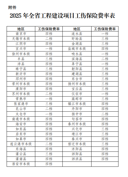 根据《省人力资源社会保障厅 省财政厅 省税务局关于印发江苏省工伤保险费率管理办法(修订版)的通知》(苏人社规﹝2023﹞2号)要求,结合各地2024年工程建设项目工伤保险基金收支比,现确定2025年全省工程建设项目工伤保险费率(详见附件)。请各地依法依规办理工程建设项目参加工伤保险有关工作,确保政策规范落实,确保基金安全完整。各地在落实过程中遇到重大问题,及时向省厅报告。