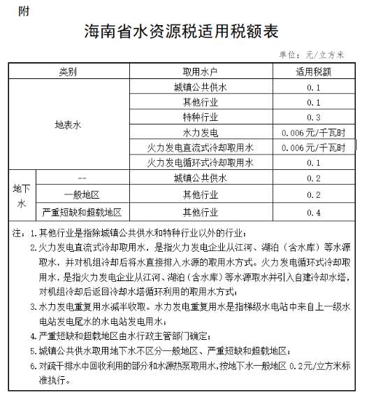 附:海南省水资源税适用税额表