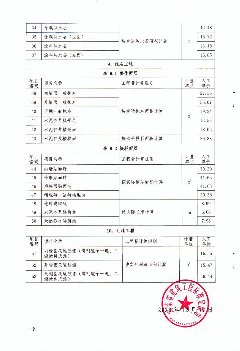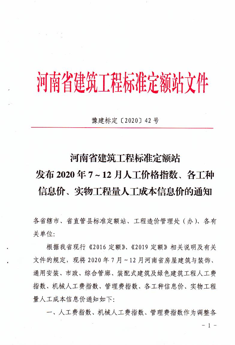 豫建标定【2020】42号 河南省建筑工程标准定额站发布2020年7—12月人工价格指数、各工种信息价、实物工程量人工成本信息价的通知