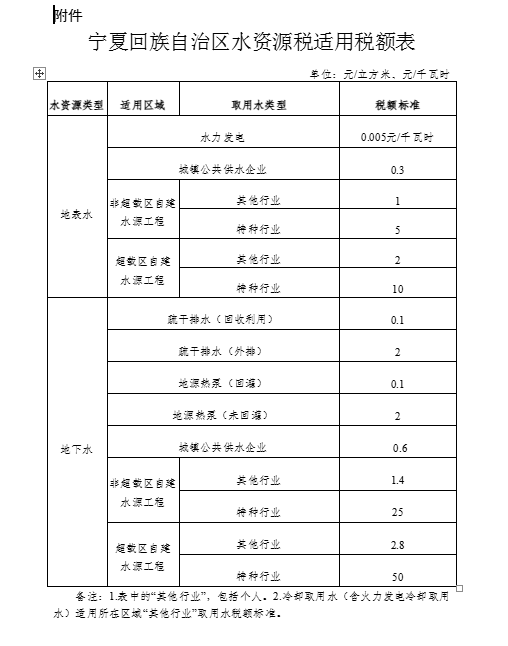 一、水资源税适用税额,以《水资源税改革试点实施办法》(财税〔2024〕28号)所附《各省、自治区、直辖市水资源税最低平均税额表》规定的最低平均税额为基础确定,具体按照《宁夏回族自治区水资源税适用税额表》执行。