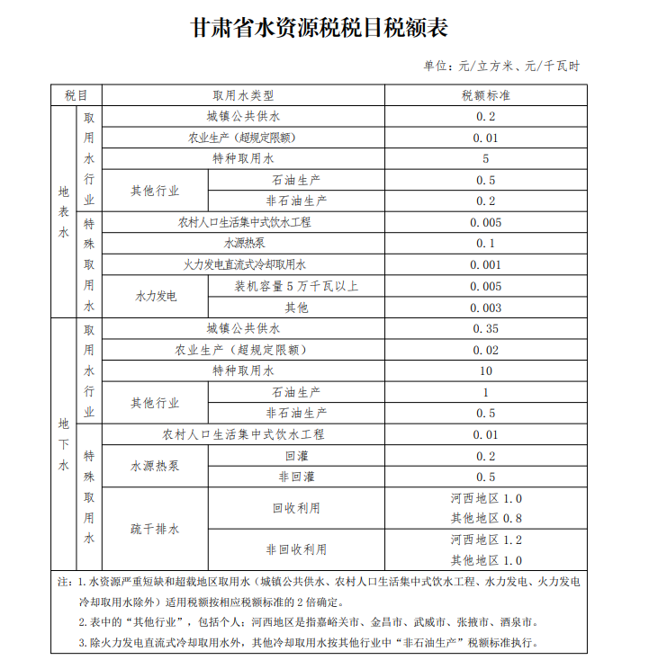 三、水资源税具体适用税额按《甘肃省水资源税税目税额表》执行。
